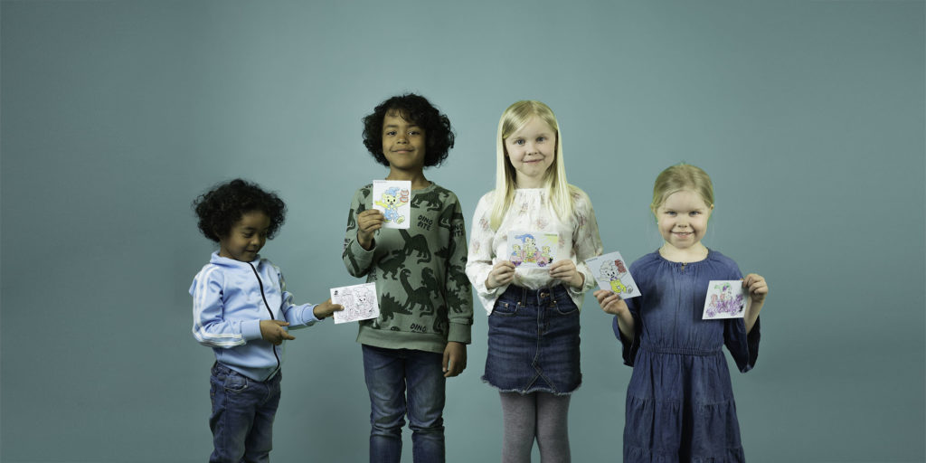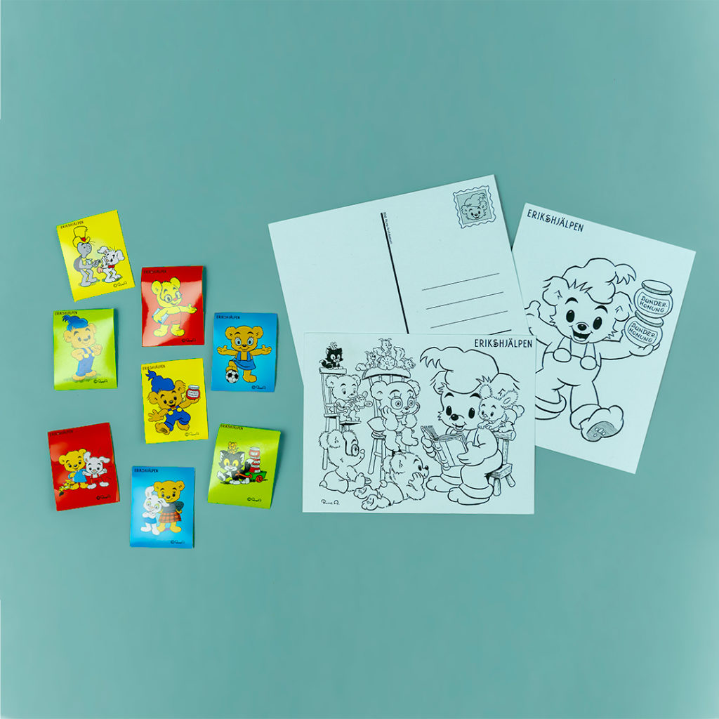 • 100 målarkort i tjockare vykortskvalitet med fyra olika motiv med Bamse och hans vänner